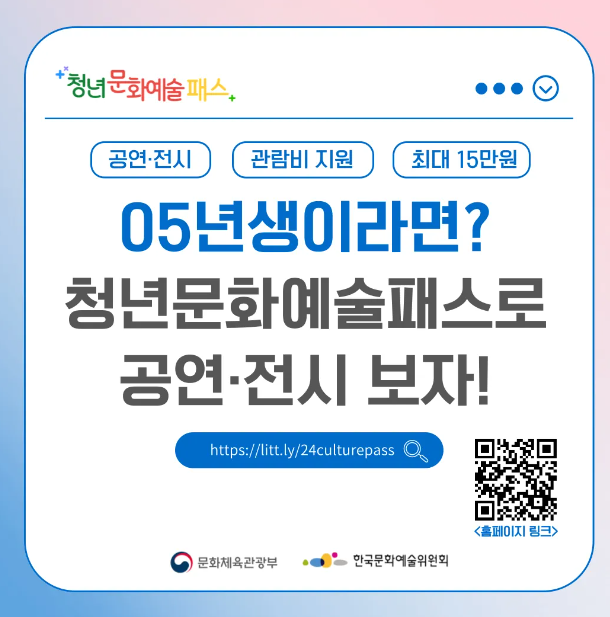 2005년생이라면 누구나 받을 수 있는 혜택! 바로 청년문화예술패스입니다. 대한민국 19세 청년이라면 받을 수 있는 혜택으로 총 16만 명에게 지원해 드립니다. 10만 원 (국비)+5만 원 (지방비) 로 최대 10만 원~16만만 원까지 받을 수 있는데, 12년 동안의 긴 학업기간을 마치고 사회에 첫 발을 내딛는 청년들에게 공연 또는 전시 관람비를 지원합니다. 이는 19세 청년들에게 문화향유 기회를 제공하고 예술창작활동에 대한 간접적 지원과 문화예술시장 활성화를 목적으로 하는 사업입니다.